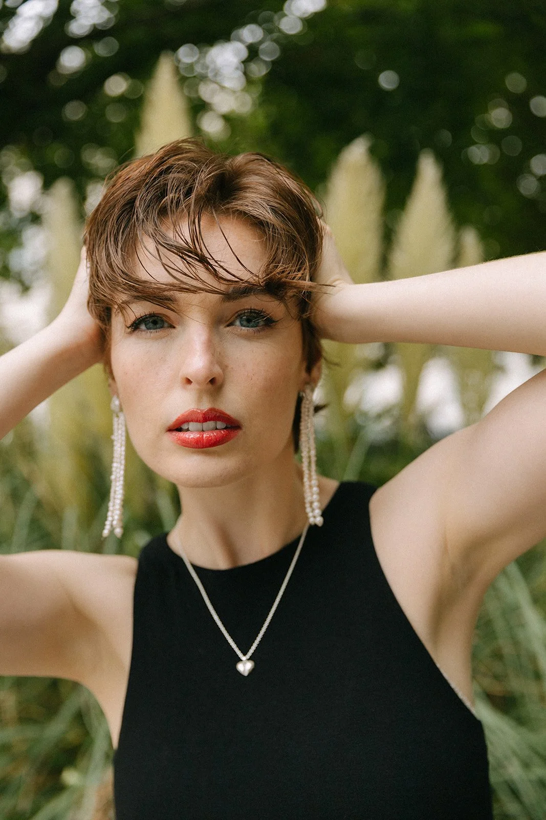 A woman with short, reddish-brown hair, blue eyes, and red lipstick posing outdoors with her hands in her hair, wearing a black sleeveless top, long pearl earrings, and a silver necklace with a heart pendant, against a blurred green foliage backgroun