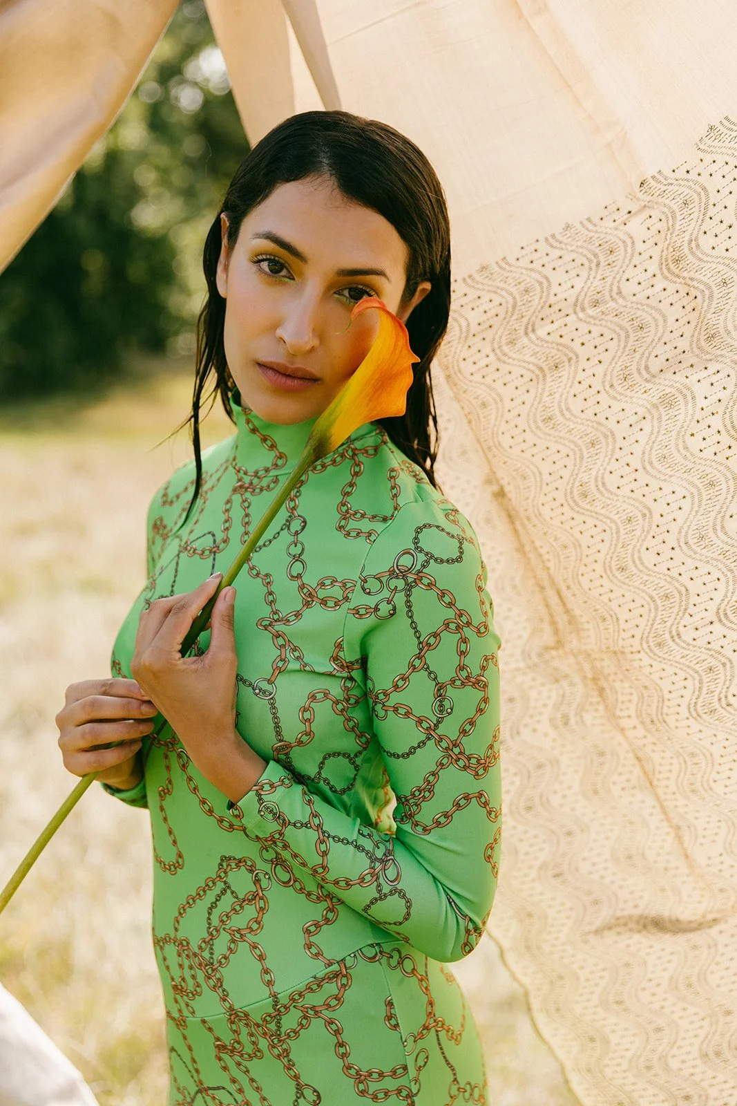Woman with curly hair wearing a white open shirt, green pants, and layered necklaces, sitting on a concrete bench against a neutral wall.